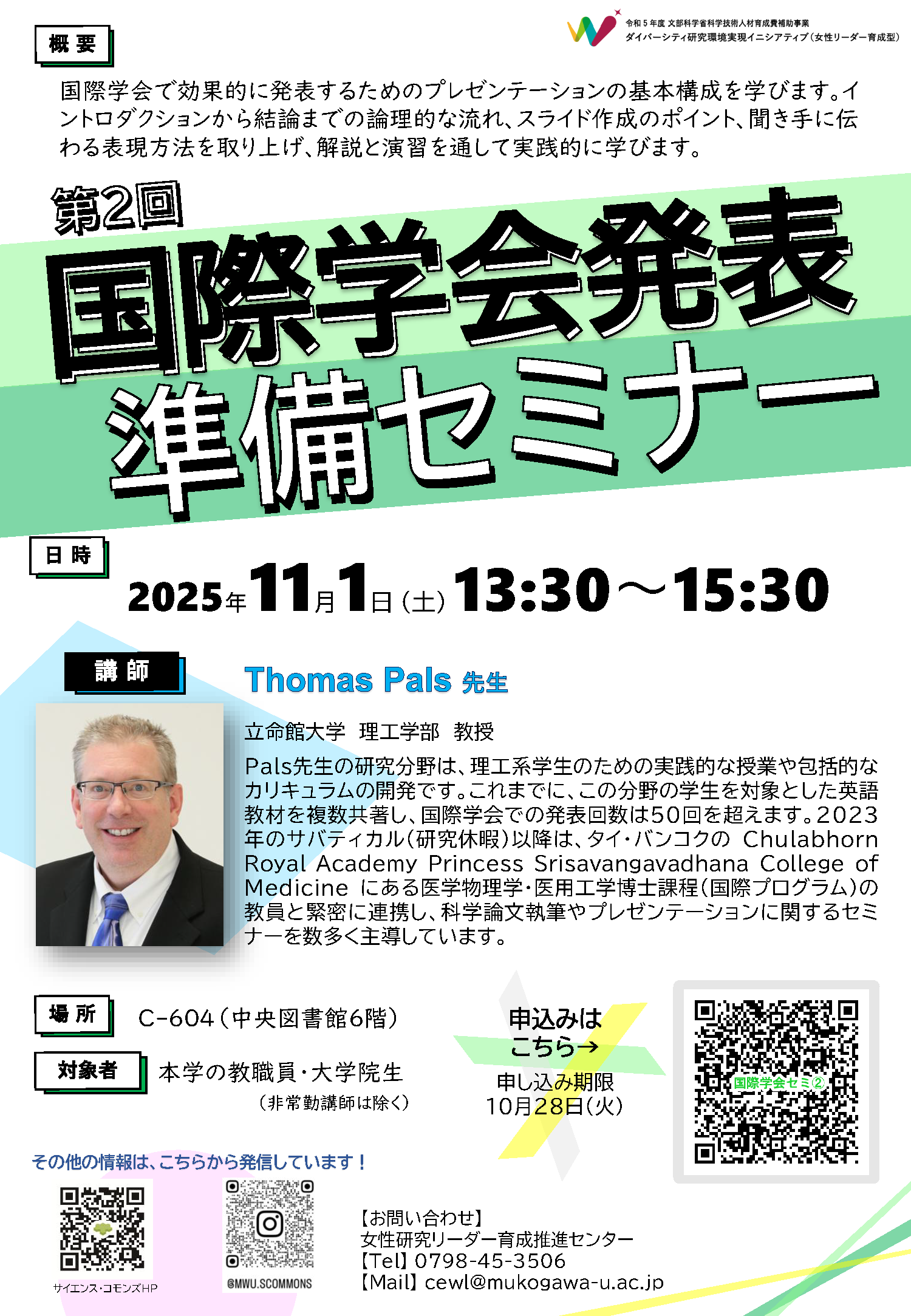 | 講師 | Thomas Pals 先生 立命館大学 理工学部 教授 Pals先生の研究分野は、理工系学生のための実践的な授業や包括的なカリキュラムの開発です。これまでに、この分野の学生を対象とした英語教材を複数共著し、国際学会での発表回数は50回を超えます。2023年のサバティカル(研究休暇)以降は、タイ・バンコクの Chulabhorn Royal Academy Princess Srisavangavadhana College of Medicine にある医学物理学・医用工学博士課程(国際プログラム)の教員と緊密に連携し、科学論文執筆やプレゼンテーションに関するセミナーを数多く主導しています。 |