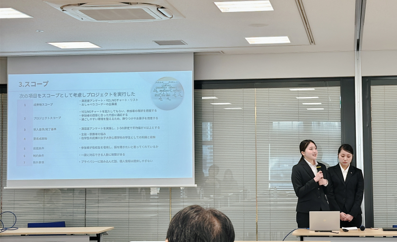 今回発表した内容は、心理学科の科目の「社会実践実習Ⅰ」の一環として実施したプロジェクト活動をまとめたものです。発表では、自ら設定した課題に対して、顧客価値の分析、計画立案、実行までの一連のプロセスについて、プロジェクトマネジメントの観点から報告しました。専門家の前で自らの実践を発表する貴重な機会となり、学生たちは大きな自信と多くの学びを得ることができました。