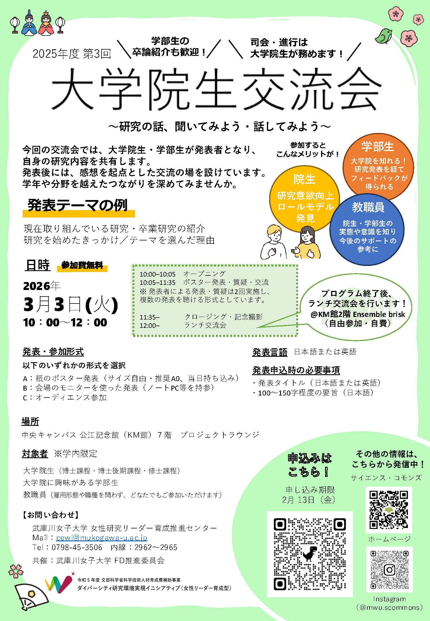 | 対象 | 本学大学院生(博士課程・博士後期課程・修士課程)、大学院に興味がある学生、教職員(雇用形態や職種を問わず、どなたでもご参加いただけます) |