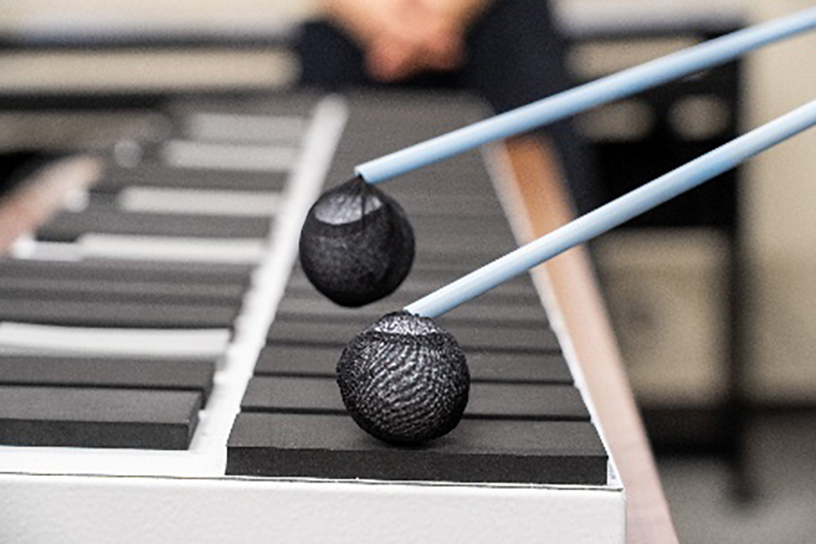 鍵盤楽器演奏は、意図した音に対応するキーを適切なタイミングで打鍵する連続動作により成り立っている。演奏者がどのように演奏すべき音を打鍵しているのか実証するため、大澤准教授はピアノ演奏中の感覚情報(視覚・聴覚)の役割を探る実験を開始した。具体的には、ピアノ演奏者が目隠しをする、演奏している電子ピアノを無音にする、といった方法で視聴覚に制限を与えたうえで、さまざまな旋律を実験参加者に演奏してもらい、演奏にどのぐらい支障があるかを測定した。その結果、演奏者は、少しでも音が跳躍する場合、時々刻々と獲得される視覚情報を手がかりにキー位置を把握し、打鍵制御を行っていること、そして聴覚はその誤りからの修正に役立っていることが新たな発見として明らかになった。次にピアノよりサイズが小さく演奏者が鍵盤を持って演奏するショルダー型鍵盤楽器やマリンバなどを用い、指先にネイルチップを当てることや、特殊なマレットを使用することで体性感覚(触覚や、筋肉や関節の感覚、手応えなど)に制限を加えた実験を学生とともに発展させた。サイズや構え方の異なる鍵盤楽器において、共通するのは視覚の役割の重大さ、そして触覚・体制感覚や聴覚のサポートもそれぞれ無視できないという点である。